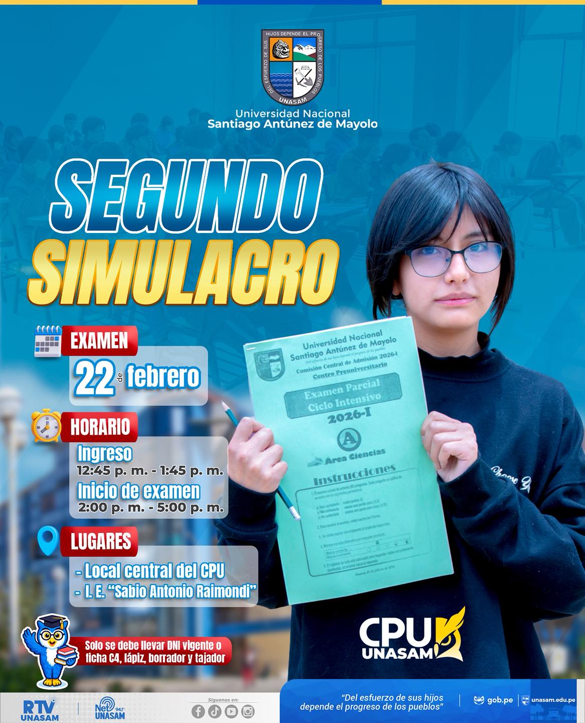 El Centro Preuniversitario de la Unasam invita a los estudiantes del Ciclo Intensivo 2026 y del Ciclo Especial de Nivelación 2026 a participar del Segundo simulacro, una experiencia diseñada para evaluar su nivel académico en condiciones reales de examen.