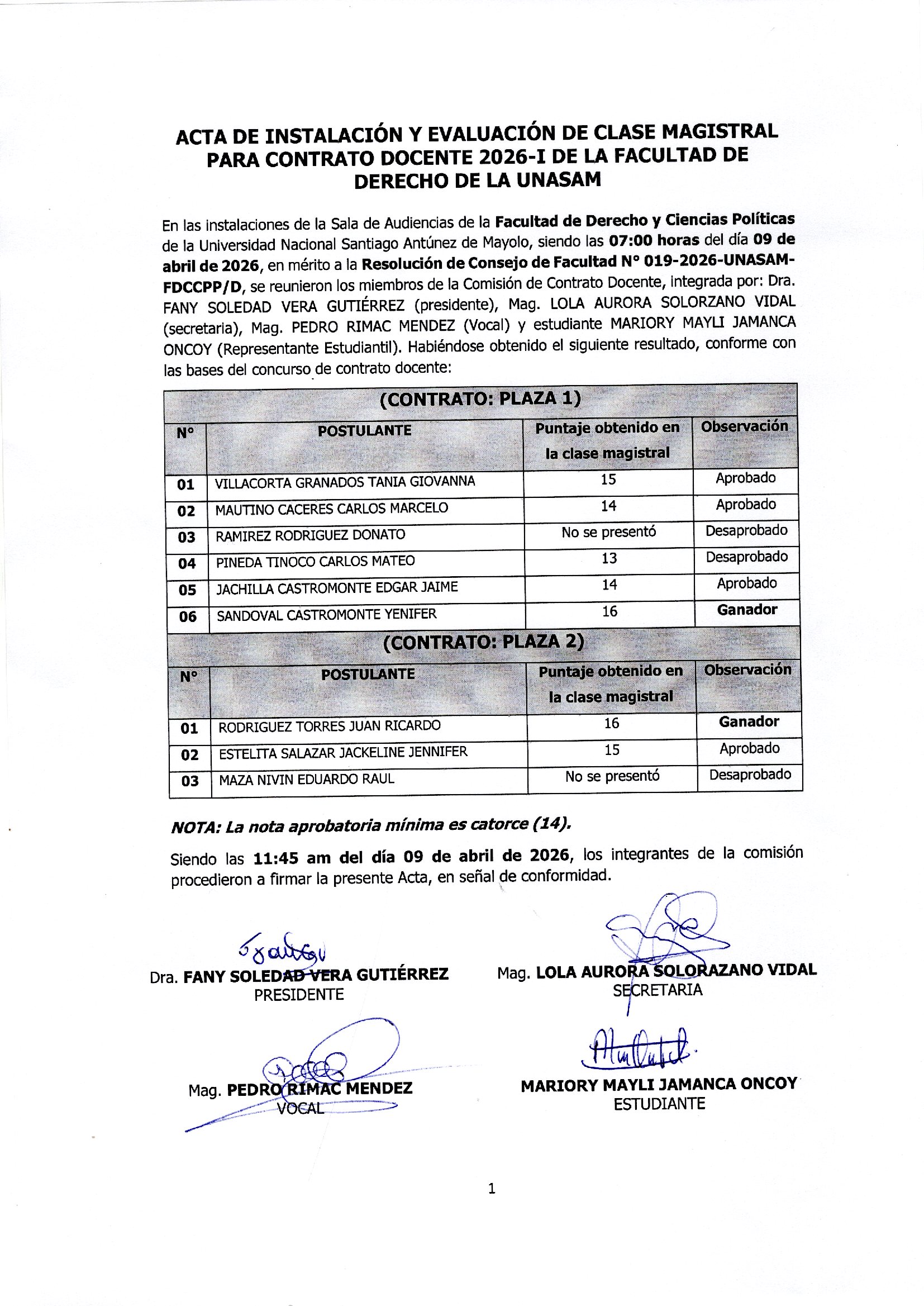 ACTA DE INSTALACION Y EVALUACIÓN DE LA CLASE MAGISTRAL PARA CONTRATO DOCENTE 2026-I, DE LA FACULTAD DE DERECHO DE LA UNASAM